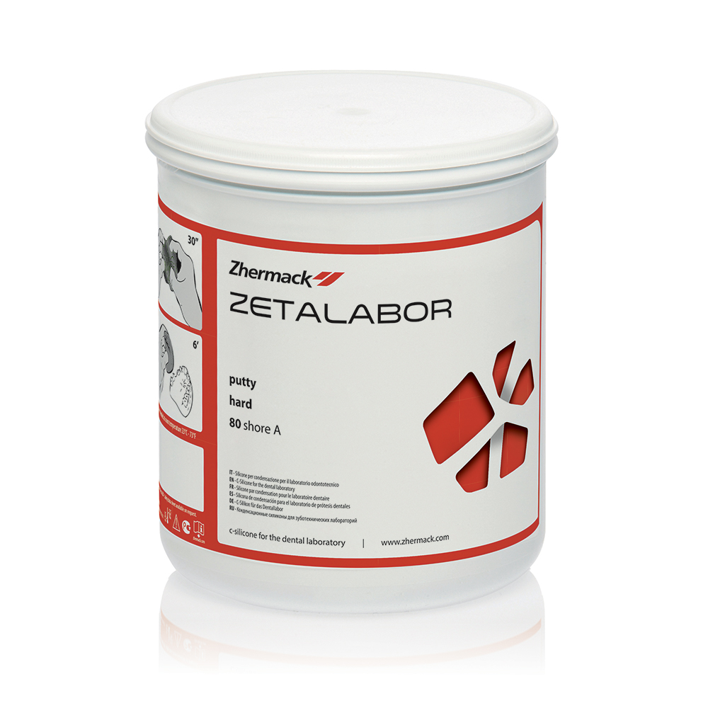 Silicone–C per condensazione specifico per mascherine, 85 Shore A – barattolo da 2,6 Kg. C400790 Zhermack Silicone–C specifico per mascherine: di controllo per la progettazione della struttura metallica; per la zeppatura della resina in protesi combinata; per l'esecuzione di manufatti protesici provvisori e per riprodurre maschere gengivali removibili (Gingifast Zhermack). Indicato anche per l'isolamento denti/gesso in muffola <b>Vantaggi:</b> • Altissima scorrevolezza iniziale • Buona durezza finale • Elevata riproduzione dei dettagli • Nessuna deformazione in muffola e resistenza alla rottura • Resistenza al calore 110°C • Elevata consistenza plastica <b>Caratteristiche:</b> • Silicone miscelabile con il catalizzatore in gel • Durezza finale 85 Shore A • Non pigmentato