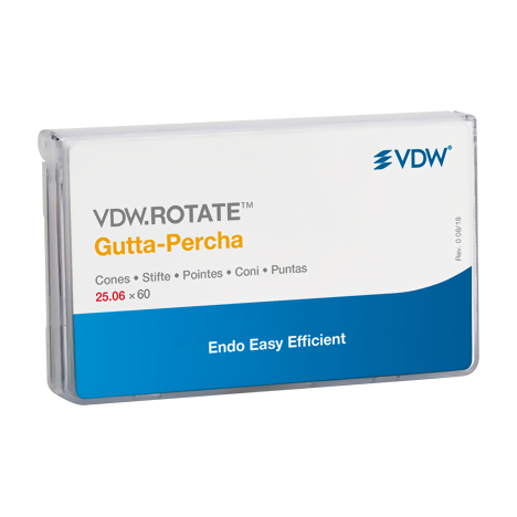 Punte di Guttaperca adatte al sistema VDW ROTATE NiTi. • Dimensioni adatte per canali che sono stati preparati con strumenti VDW ROTATE NiTi • Adatto a tutte le tecniche di otturazione a caldo e a freddo • Prodotte utilizzando il processo di stampaggio a iniezione